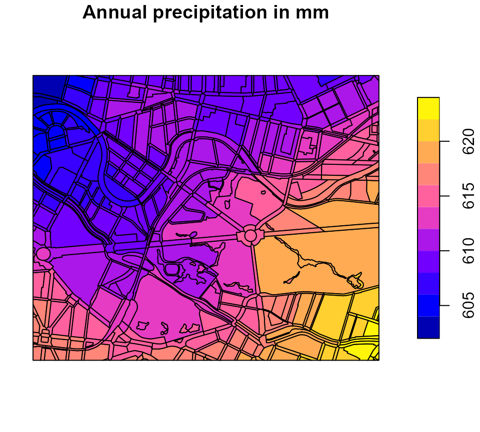 Since we provide the Berlin dataset together with geographical information we can plot the spatial distribution of a variable (e.g. the annual precipitation) in the form of a map: